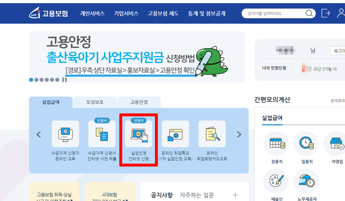 그러면 이제 다시 고용보험 사이트에서 실업인증 인터넷 신청을 합니다. 이제 실업인정을 받기 위한 신청서를 제출하는 과정만 마치면 된다.