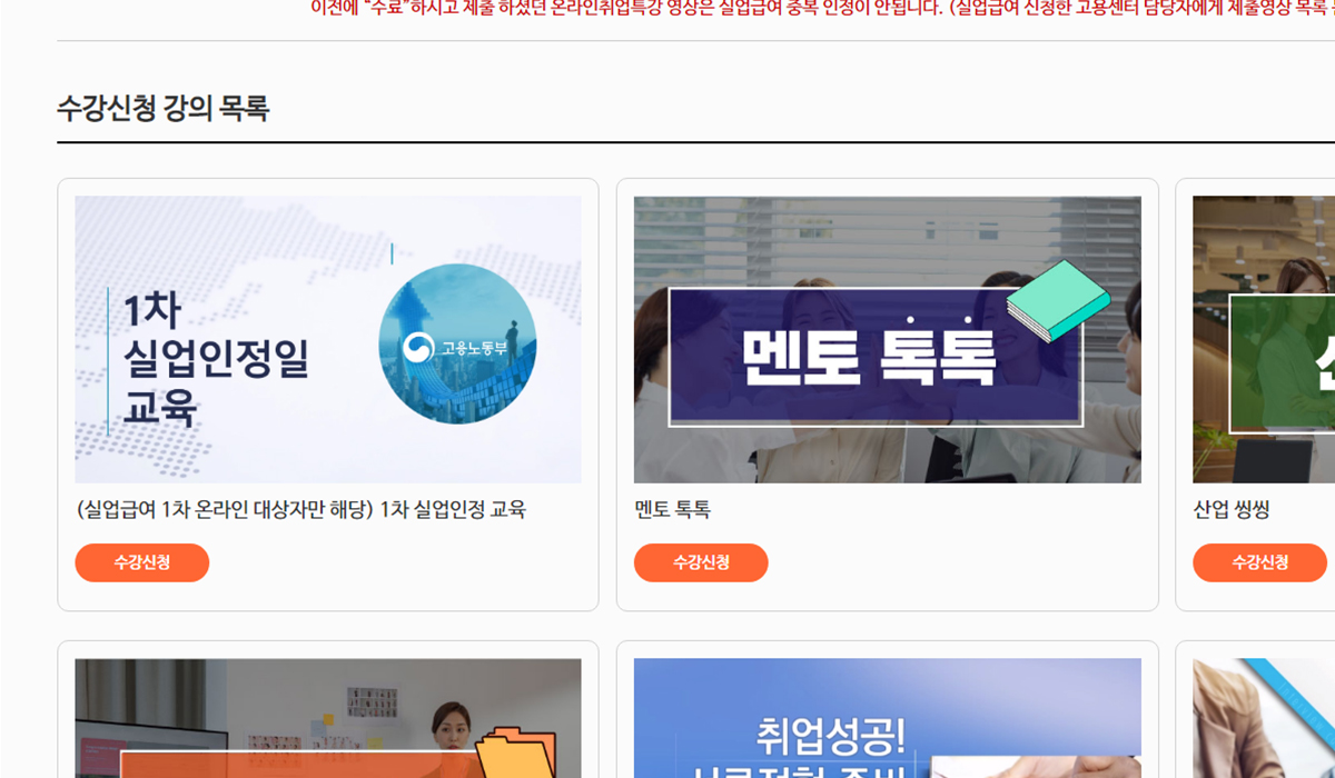 수강신청 강의 목록에 1차 실업인정일 교육이 있어서 수강 신청을 한다. (1차 인증을 위해서는 다른 강의 말고 꼭 이강의를 들어야 된다고 한다.)