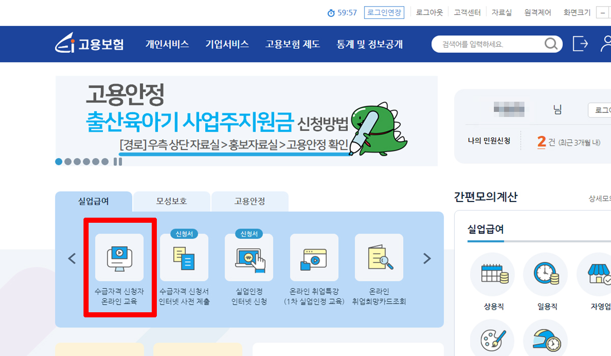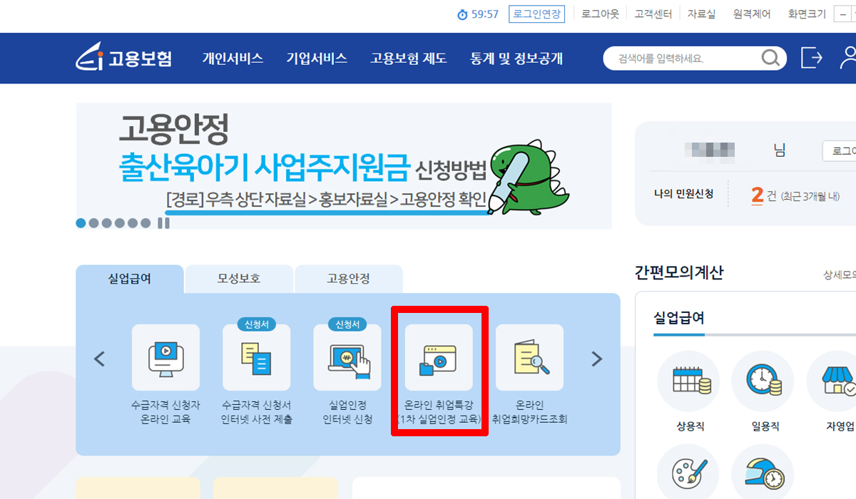 고용보험 사이트에 접속해서 온라인 취업특강에 들어간다.