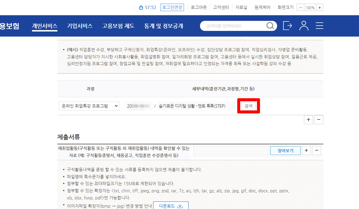 세부내역을 클릭할 수 있게 목록이 나오면 거기서 온라인 취업특강 프로그램을 선택해줍니다. 검색을 눌러 보면 내가 수강완료한 과정이 조회가 되고 선택하면 됩니다.