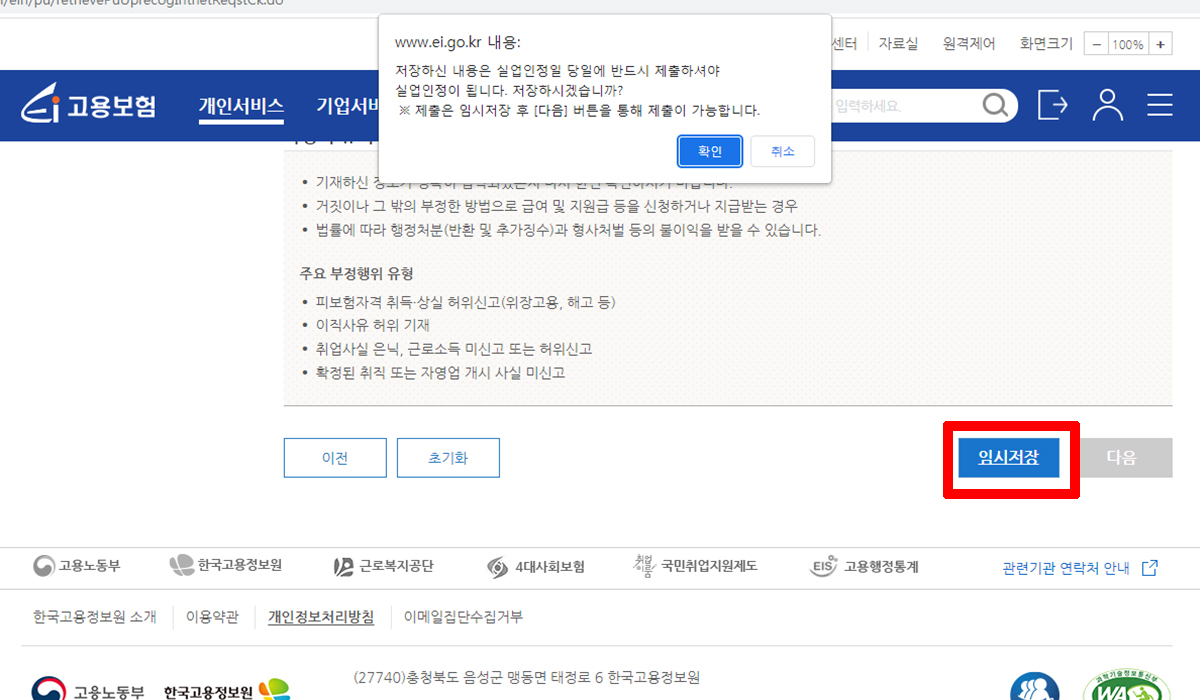 제출이 완료되면 고용보험에서 신청이 정상적으로 전송되었다는 알림메시지가 옵니다.