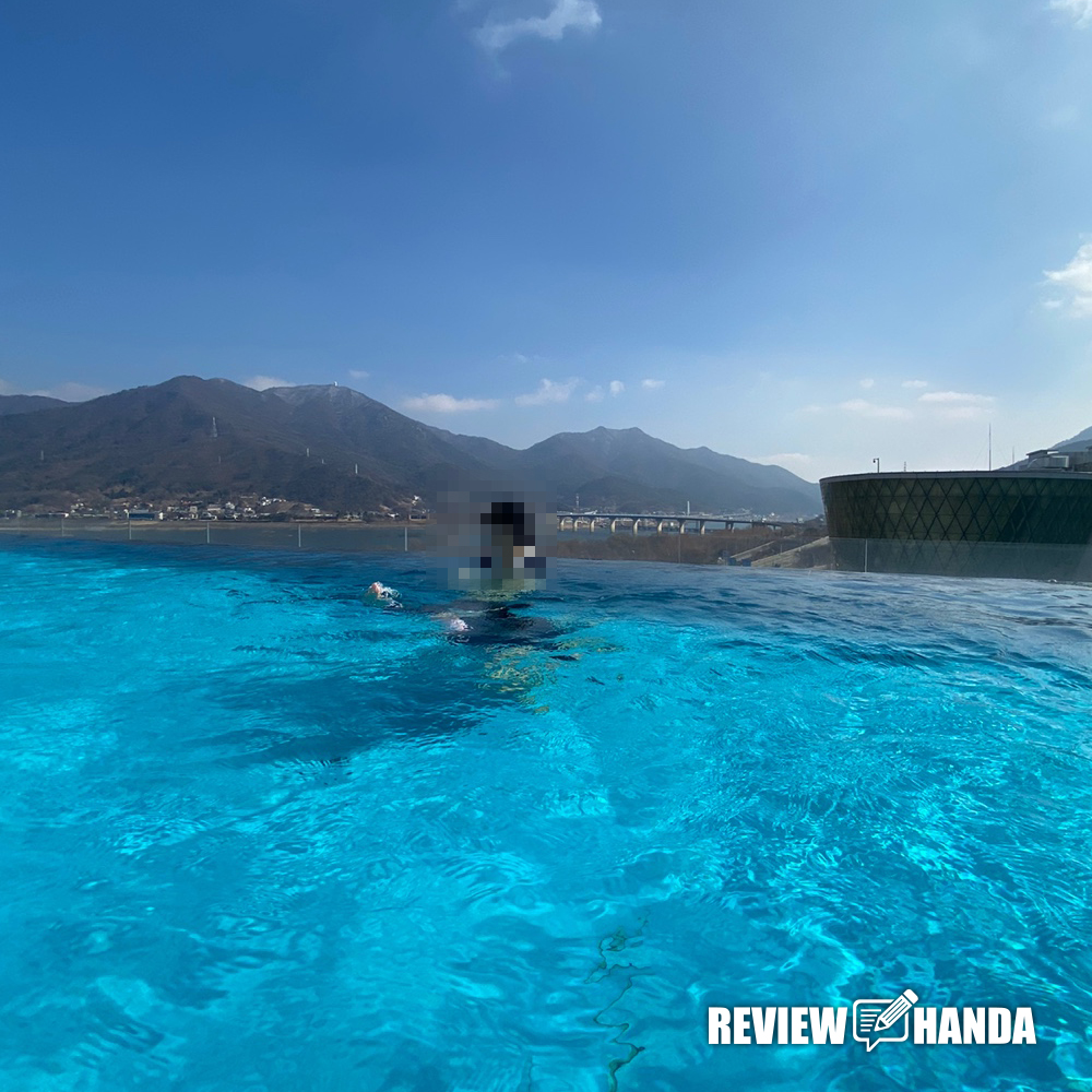 몸이 조금 따뜻해져서 이제 수영장으로 들어가본다. 물이 조금 차갑다 싶었는데 몸까지 담그고 나니 따뜻했다. 너무도 이쁜 배경을 뒤로 사진을 여러장 찍었다. 인생컷 하나 나올려나?