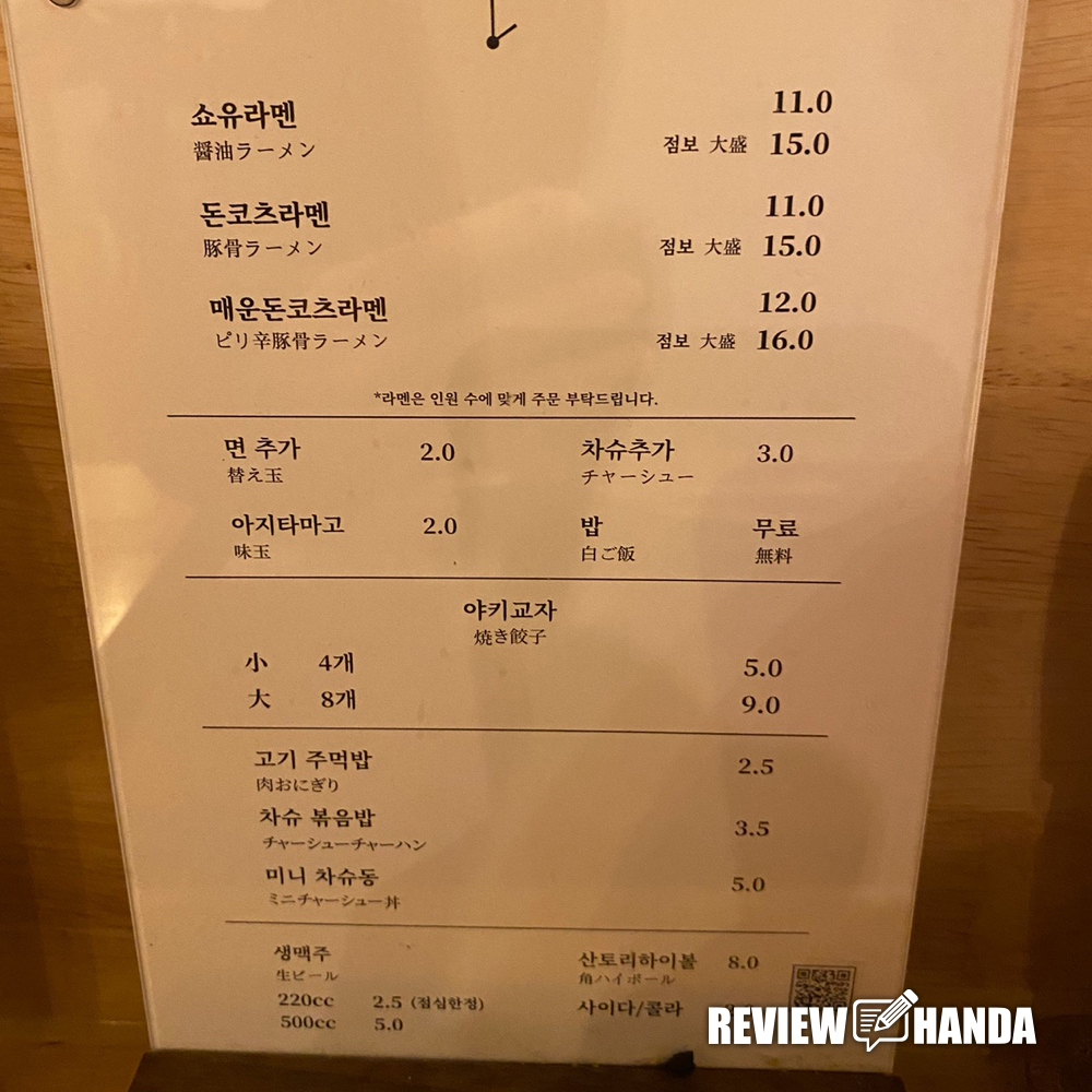 메뉴를 보고 무엇을 먹을지 고르다가 쇼유라멘과 돈코츠라멘, 그리고 고기주먹밥, 야키교자를 시켰다. 라멘은 인원수에 맞게 주문해달라고 되어있는데, 아이가 어려서 그런지 라멘2개를 시켰는데도 주문을 받아주셨다.