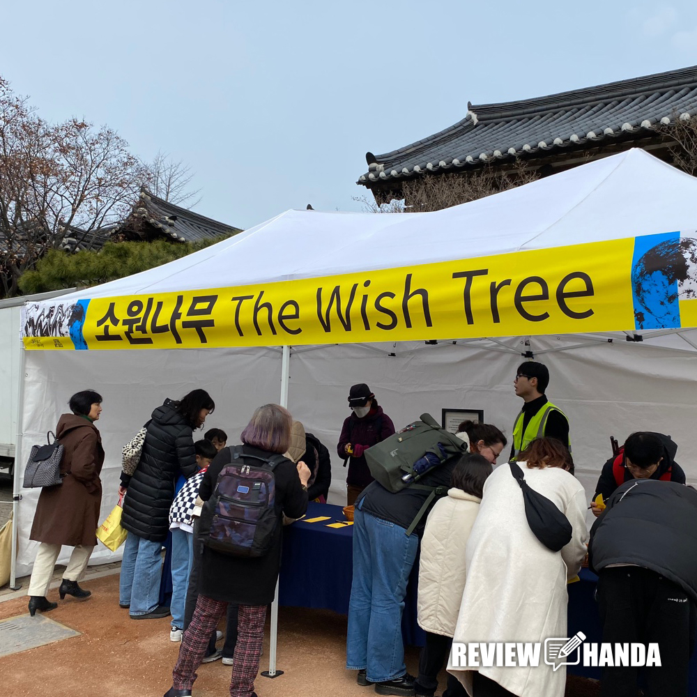 그리고 그옆에는 소원나무에 적을수 있도록 종이와 붓펜이 있어서 이루고자하는 내용을 적어봅니다. 올해 계획한 일들 이루어지도록 적어주고, 옆에 있는 새끼줄에 매듭으로 묶었줬습니다.