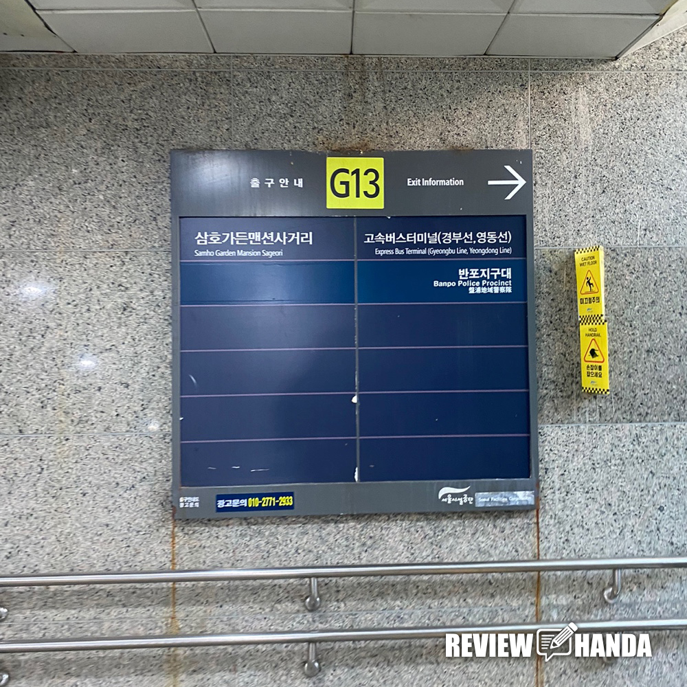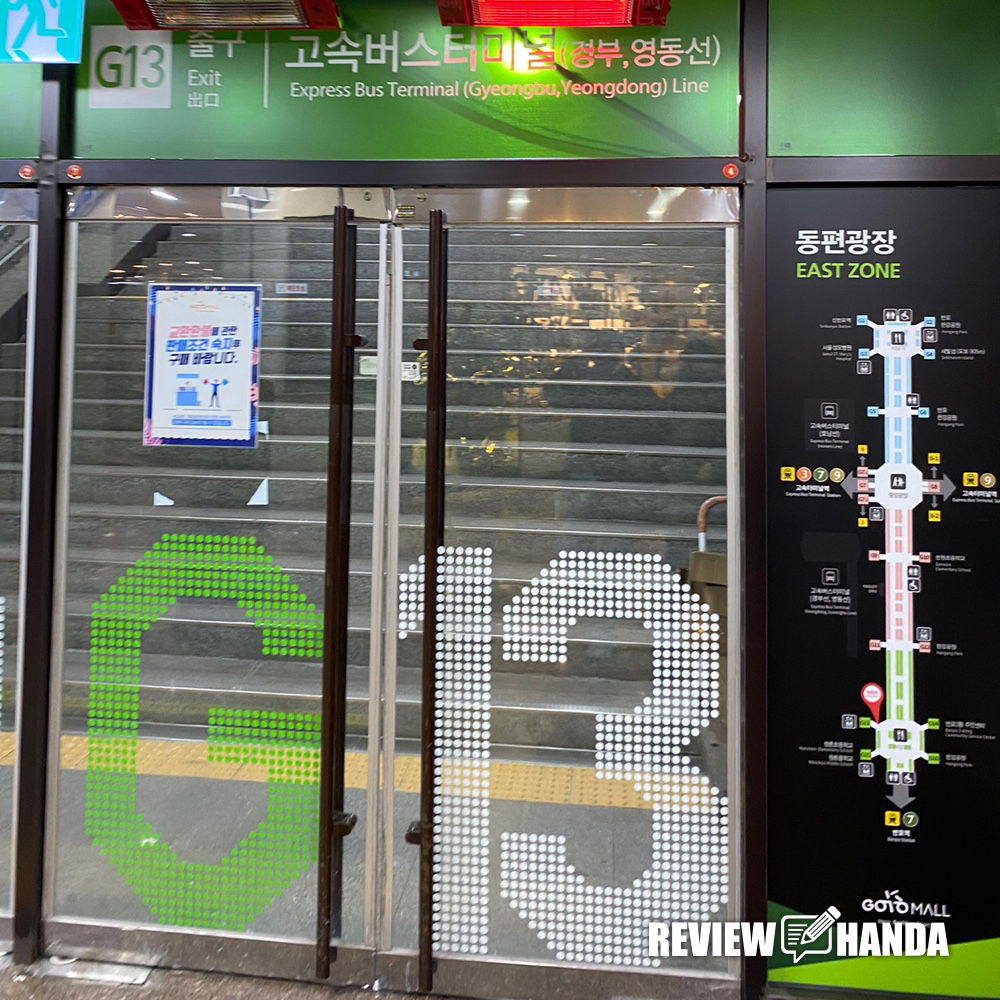 지하도에 내려오면 출구가 많다. 여기서 G13 출구 고속버스터미널 (경부,영동선) 방향으로 나가야 한다.