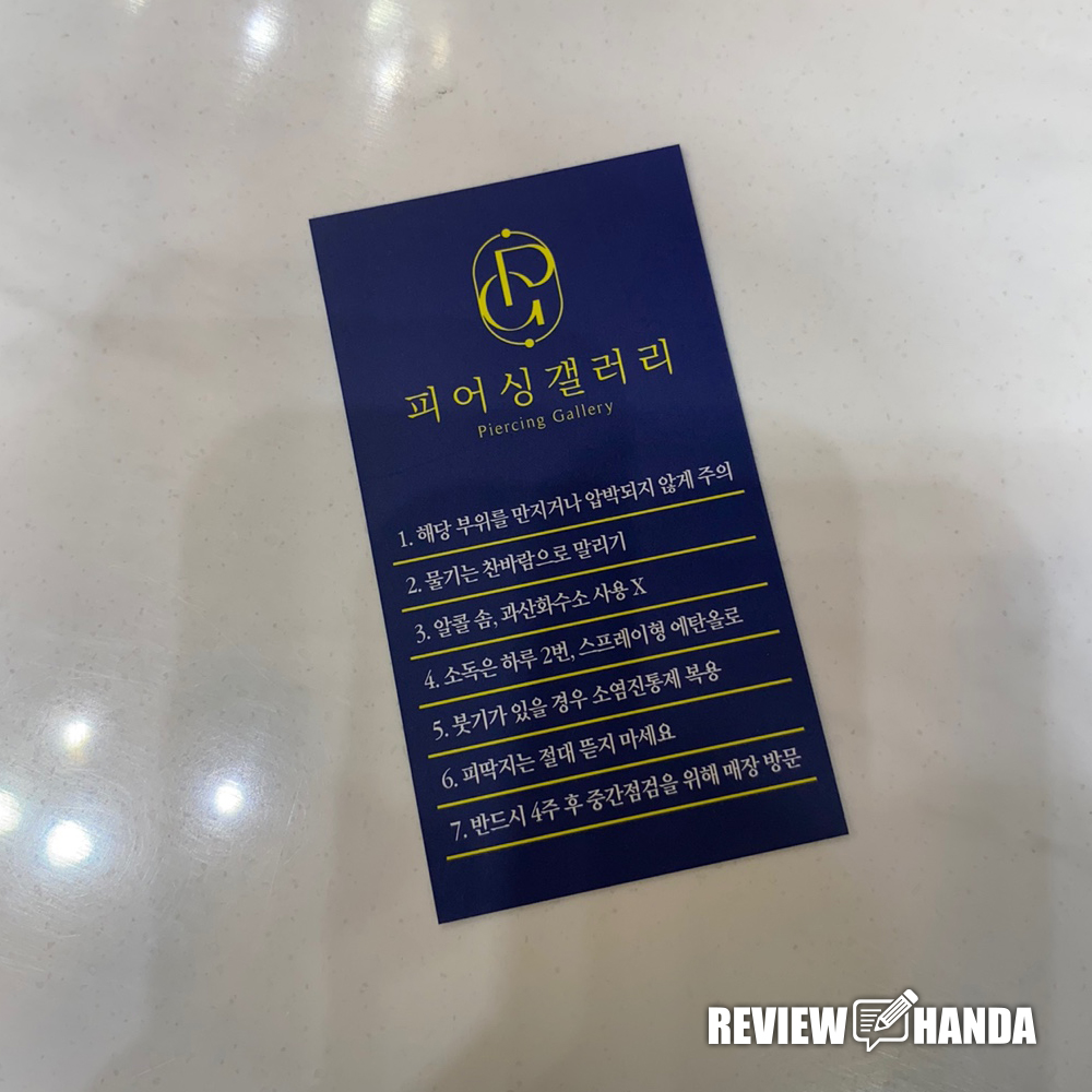 사장님께서 안아프게 해주신거에 감사드린다. 관리를 어떻게 해야하는지 물어보니깐 한달동안 빼지말고 지내라고 하신다. 그리고 만약 조금 불편하면 소독용 스프레이 정도만 해줘도 된다고 한다. 피어싱을 하게 되면 조금 관리가 필요하지만, 일반 귀뚫는거는 크게 불편함이 없을거라고 한다. 그리고 금속알러지가 있는 경우가 있는데, 그걸 방지하기위해서 금으로 했기에 특별히 걱정안해도 될거같다고 하신다.