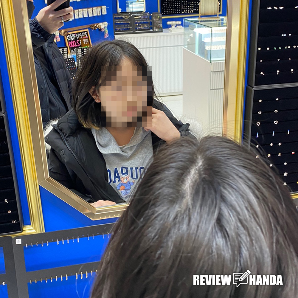 사장님께서는 귓볼에 위치를 찍어주고 괜찮냐고 물어본다. 아내가 괜찮은거 같다고 하니깐 바로 진행을 한다. 소독을 하고 긴 바늘같은 것이 들어가더니 그다음에 바로 귀걸이를 끼워준다. 혹시나 딸아이가 아파서 울면 어떡하지?걱정했는데.. 순식간에 끝났다.
