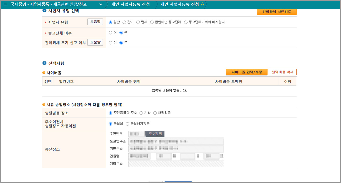 사업자 유형을 선택하시고 나면, 서류송달장소를 입력하게 되어있는데요. 저는 자택으로 입력을 했습니다.