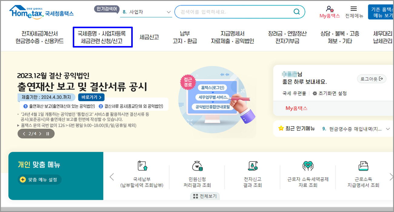 상단 메뉴에 있는 국세증명,사업자등록 세금관련 신청/신고를 클릭합니다.