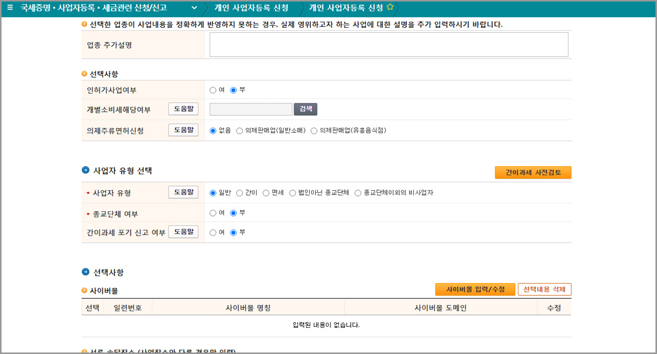 홈텍스에서 개인사업자 등록은 다음과 같은 절차로 진행하시면 됩니다.