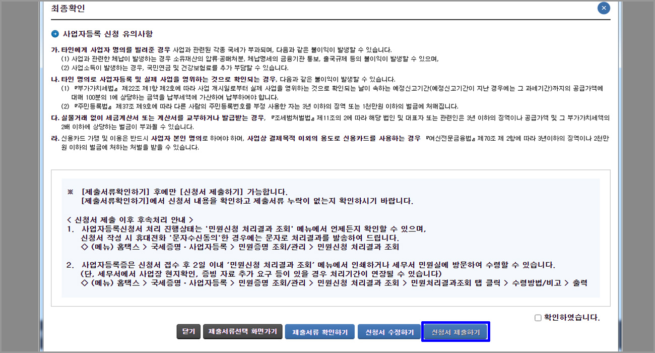 참고로 저는 무자수신여부에 체크를 안해놔서 문자를 못받았는데요. 처리완료 문자를 받으시려면 인적사항 입력시 휴대전화번호에 수신동의를 해주시는게 좋습니다. 이상으로 홈택스에서 개인 사업자등록하는 방법에 대해서 알려드렸습니다. 조금이나마 도움이 되셨으면 좋겠습니다.