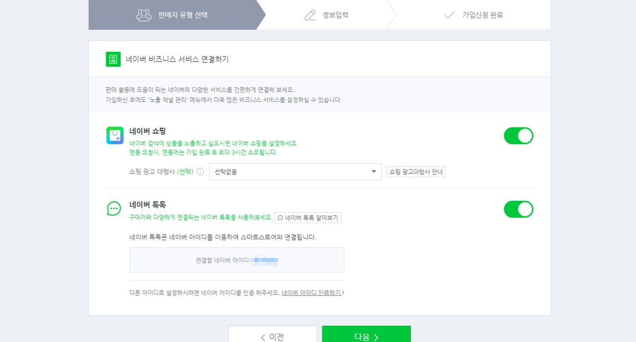 네이버 쇼핑과 네이버 톡톡을 연결할거인지를 체크하는 건데요. 둘다 오픈해주시는게 좋겠죠?
