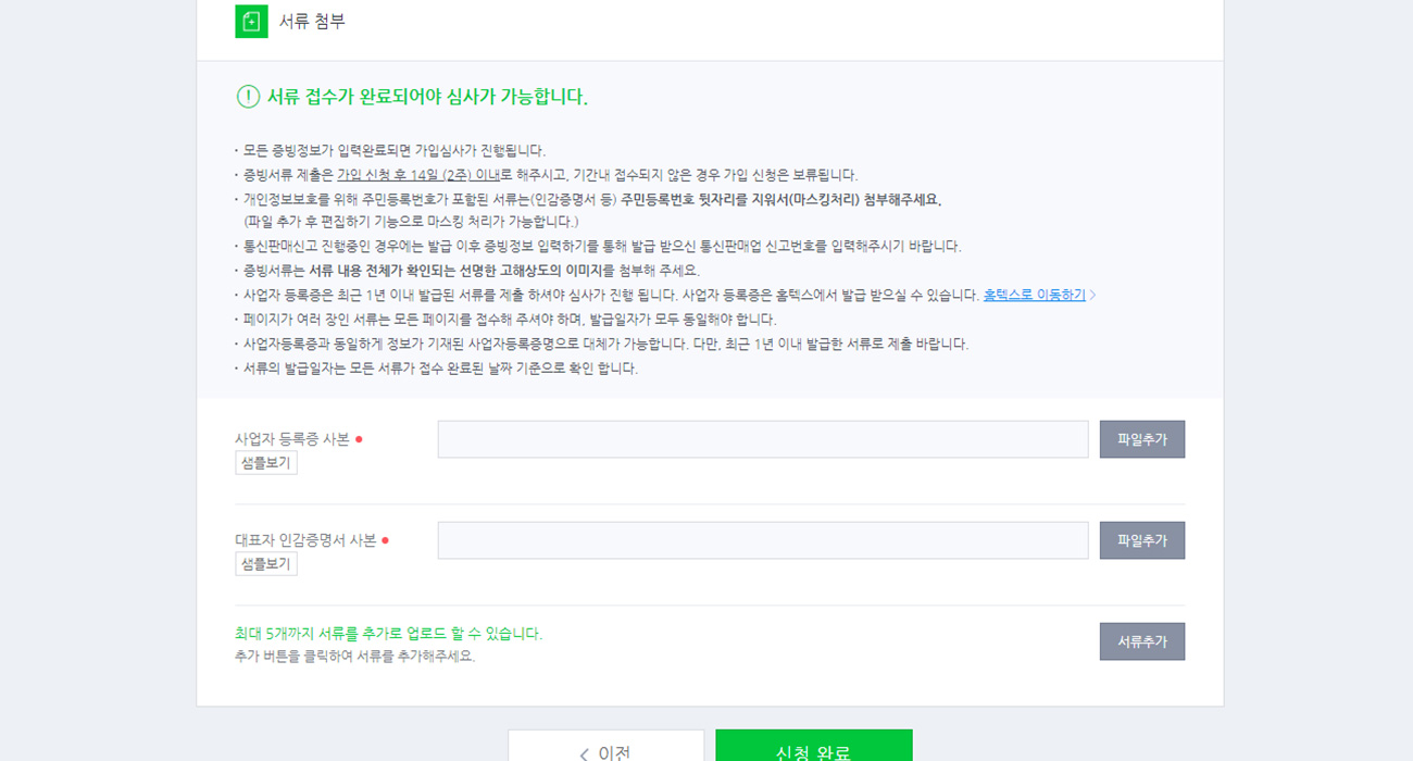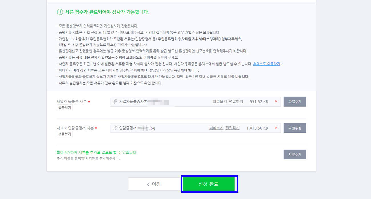 이제 마지마긍로 서류 첨부만 해주시면 됩니다. 필수서류였던 사업자등록증사본, 통장 사본을 파일 추가로 넣어주시면 됩니다. 휴대폰 인증을 안할경우 인감증명서를 첨부하시면 됩니다.