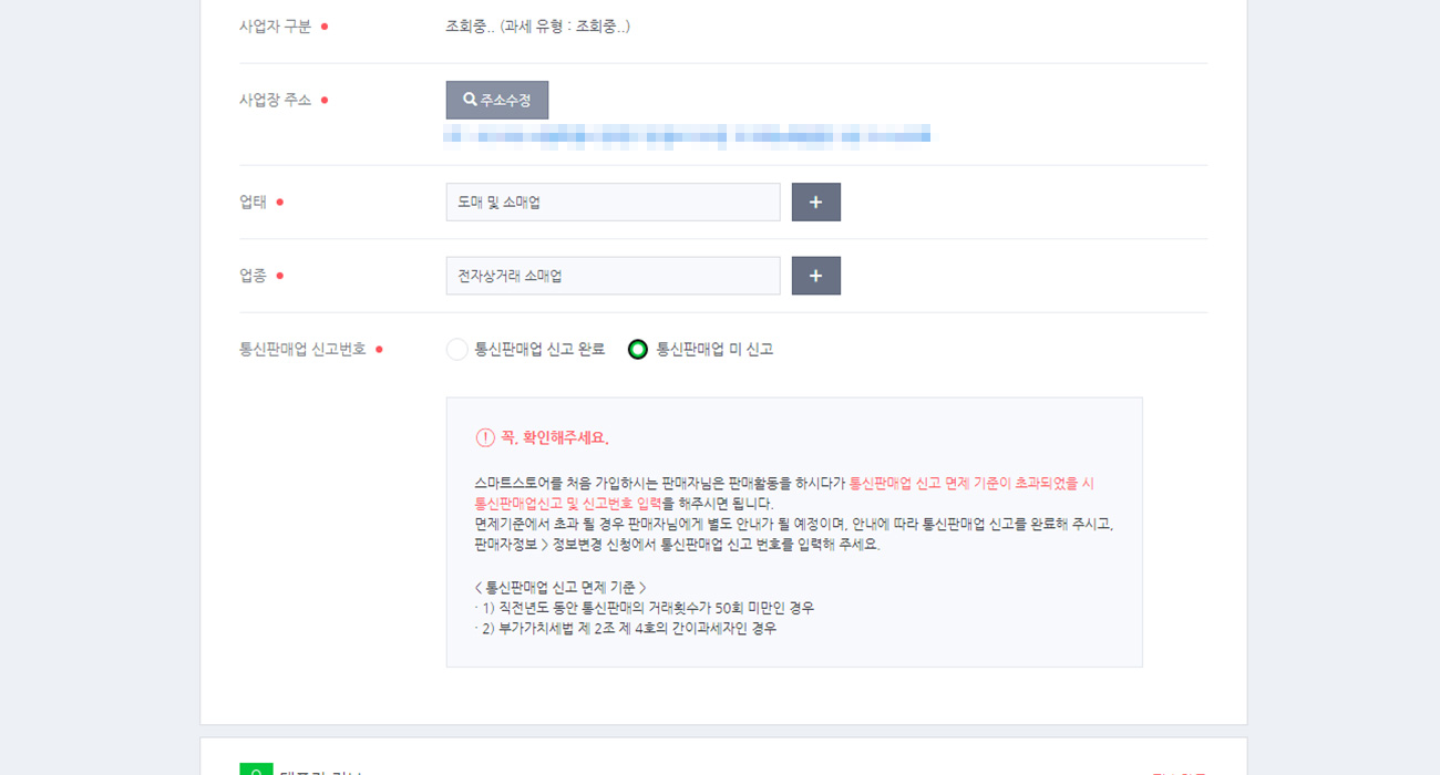 통신판매업 신고번호는 아직 하지 않았기에 미신고로 체크해줍니다. 통신판매업 신고후에 입력하시면 됩니다
