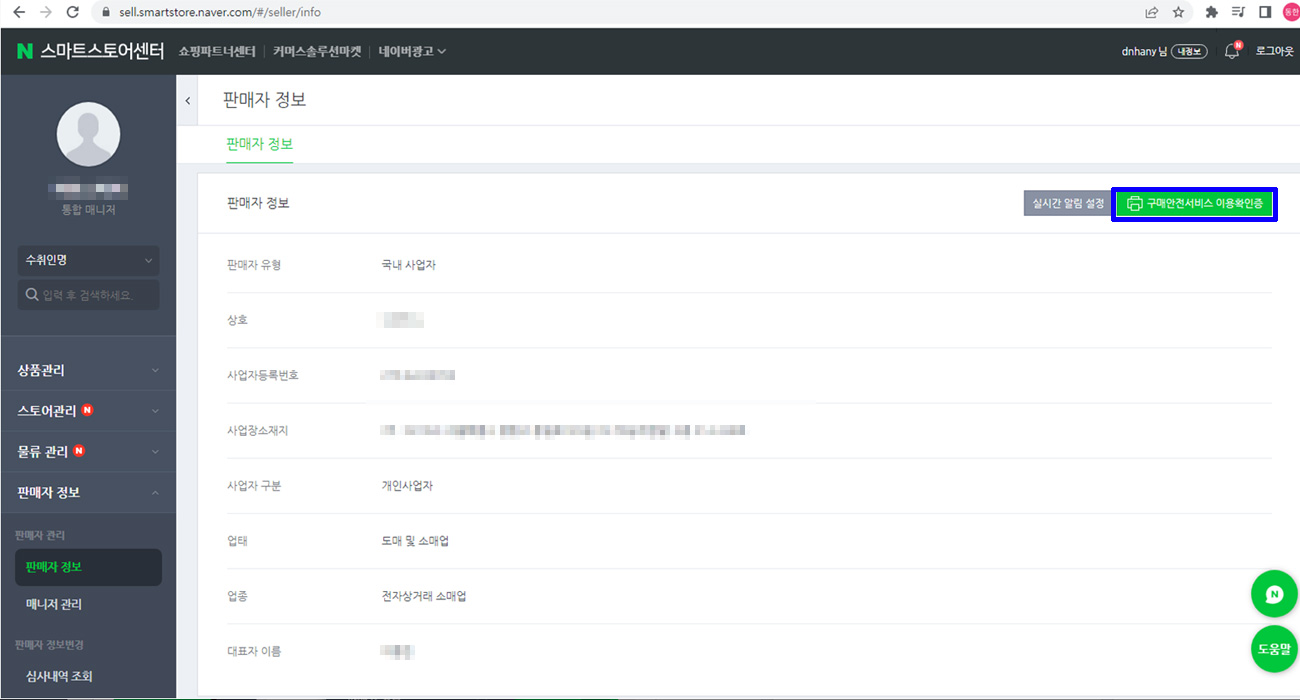 좌측 메뉴에 판매자정보를 눌러주시면 오른쪽 상단에 구매안전서비스 이용확인증이라고 되어있는 버튼이 보이는데요.