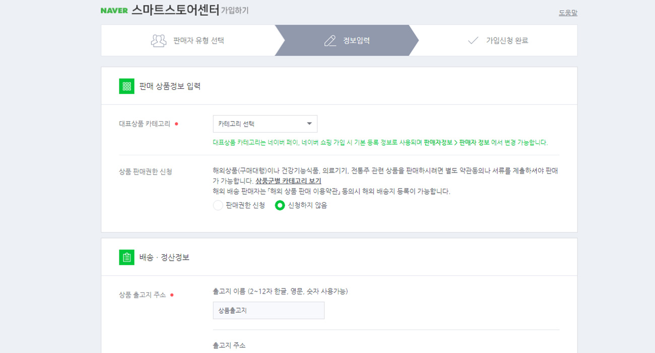대표 상품 카테고리를 선택해주시고, 배송, 정산정보까지 입력해주세요~